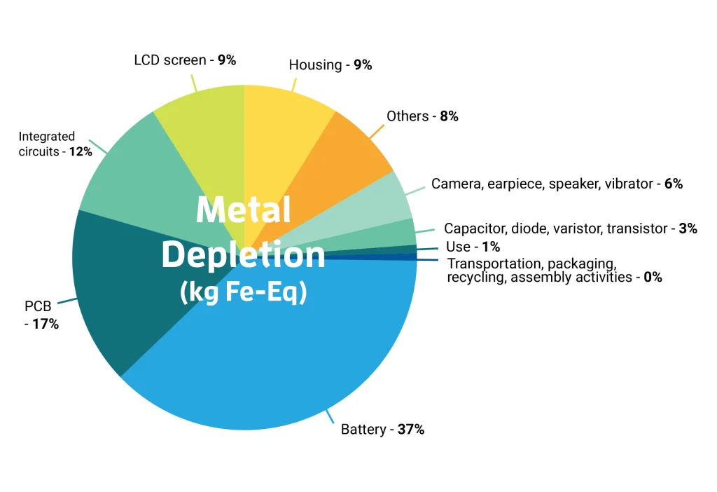 Among the components used to produce a Fairphone, the battery has the highest contribution to metal depletion with 1.5 kg Fe-eq, followed by the PCB with 0.69 kg Fe-eq., integrated circuits with 0.47 kg Fe-eq. and the LCD screen with 0.36 kg Fe-eq.