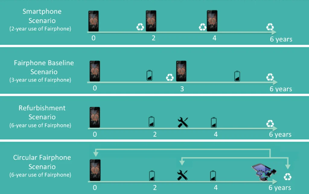 The baseline scenario has the same assumptions as the main LCA. Fairphone owners use their phones on average for 3 years. So over 6 years, they would need to buy two phones.