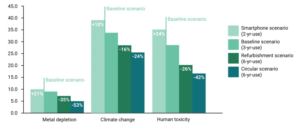 The Circular Scenario provides even greater opportunities for improving the environmental performance of the Fairphone in the long term. Compared to the current situation (Baseline Scenario), it would result in 53% less metal depletion, 24% less climate change and 42% less human toxicity. In this instance, customers should still be persuaded to use their phones for six years. But this approach would also require additional infrastructure and investments such as a facility to dismantle used Fairphones and refurbish others. More research is needed to determine the feasibility of setting up a dismantling facility and the recovery rate of materials.
