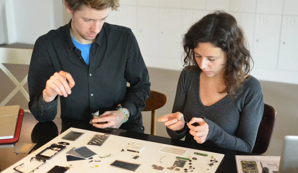 Nico and I taking apart the components of a Fairphone.