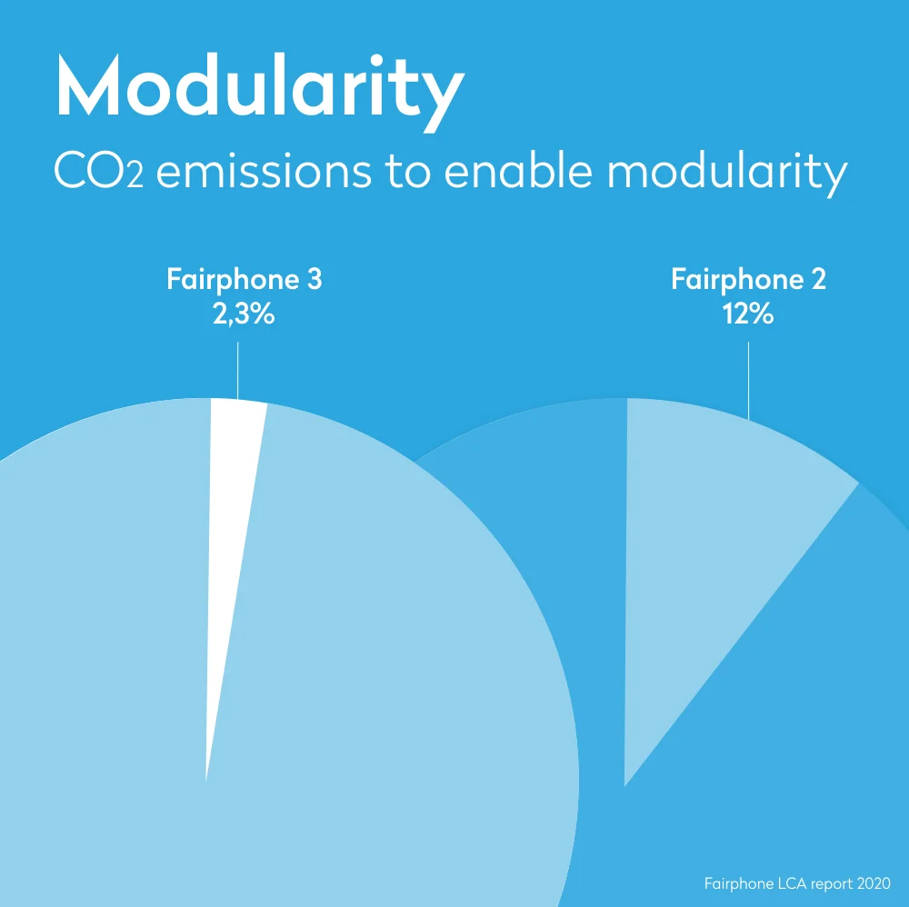 What’s more, we’ve achieved big improvements in the carbon cost of module production. In the Fairphone 2, the modular parts contributed to 12% of the CO2 emissions in production, while in the Fairphone 3, they represent only 2.3% of the emissions in production. We’re designing for repairability at an even smaller carbon overhead.