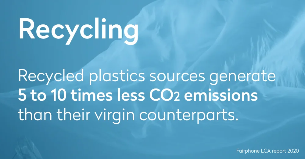 When it comes to components like the case, bumpers, and even that little screwdriver that comes with your phone, an important contributor to our lowered footprint is maximizing the use of recycled materials. The life cycle assessment reports that depending on the type of plastic, recycled sources generate 5 to 10 times less CO2 emissions than their virgin counterparts.