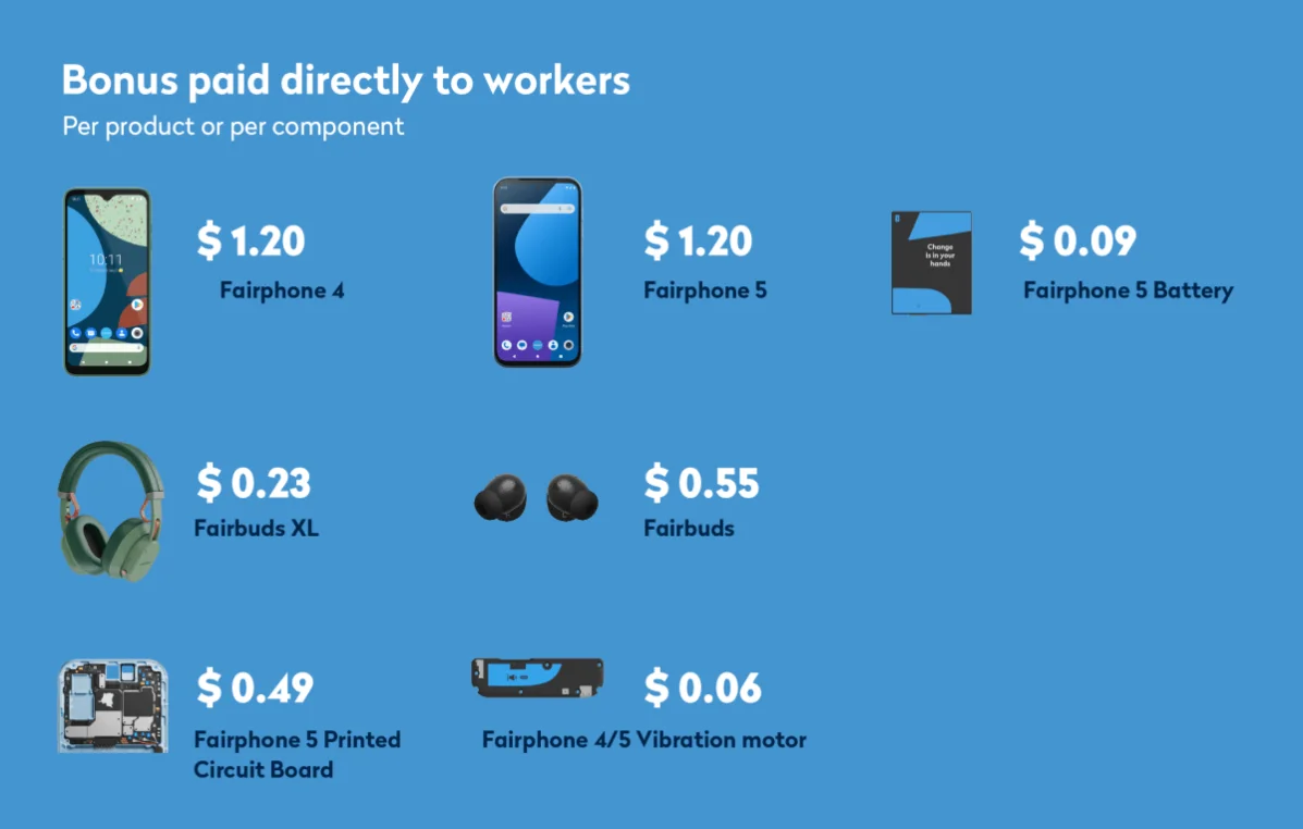 At the end of 2023, we recalculated the living wage premiums for the final assembly of our smartphones using the latest living wage estimates and production line data. The new premiums range from 23 cents for the assembly of our Fairbuds XL to USD$1.20 per smartphone assembly. This demonstrates once more how little is needed to bridge the gap to living wages.