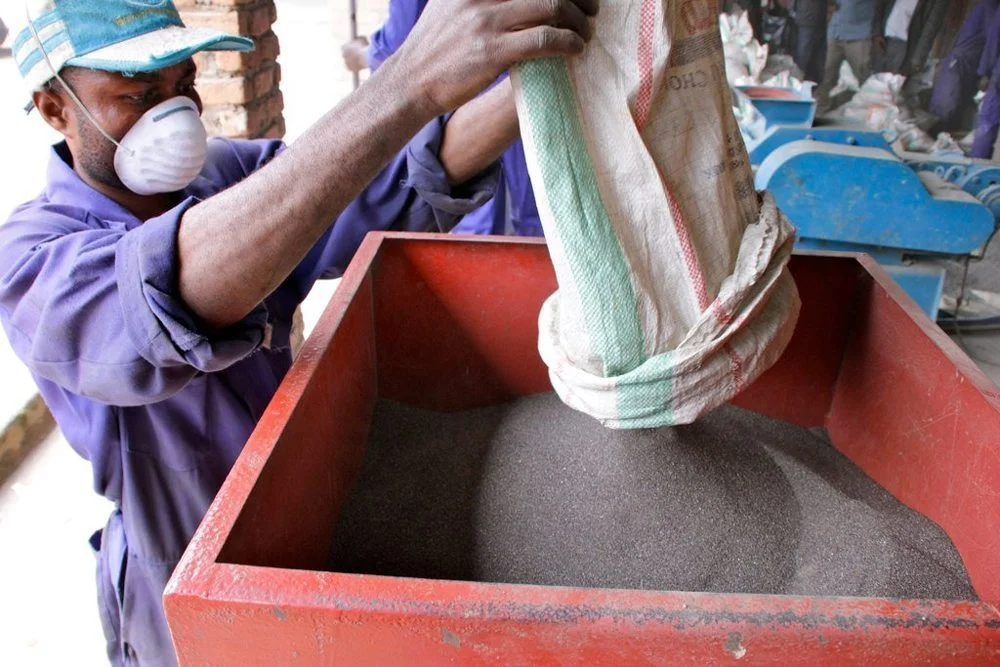 The start of the life cycle: A worker in the DRC pouring refined tin powder.
