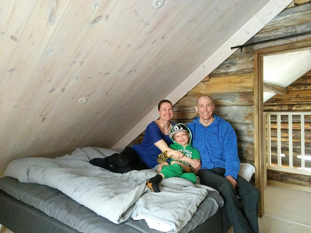 Family portrait, together with my son Dante and my husband Björn in our ecological house.