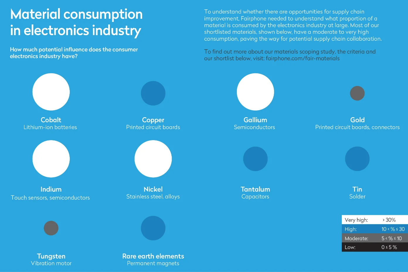 And in the spirit of collaboration, we’d like to encourage everyone to share*, use and build upon our and TDI’s research. If you have any information that you think could contribute to our materials scoping research or improvement efforts, we’d be very happy if you can let us know. Finally, while we completed this study with the Fairphone 2 in mind, we also see the value of expanding it to a wider range of materials and potentially develop an open source database. If you would be interested in using or co-developing such a database, please add your name to this list and we will contact you when there is enough interest for a follow up.
