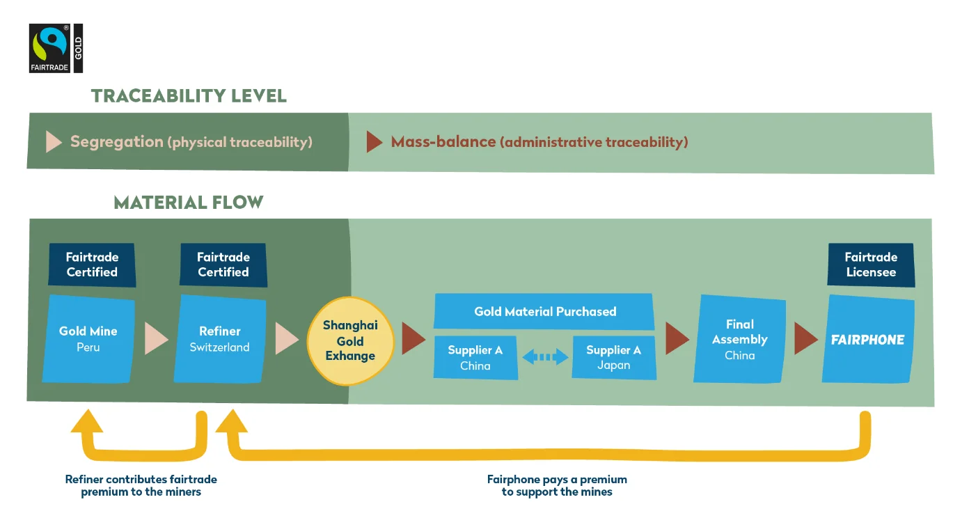 With the Fairphone 3, we, along with the Fairtrade Foundation, have begun to explore a mass-balance sourcing model to begin to scale Fairtrade gold in the electronics sector. Under this model, gold mined in a more responsible fashion from the Fairtrade certified mine remains separated from other non-certified gold until leaving the refinery. However, after this point it gets shipped to the Shanghai Gold exchange and can enter many different supply chains, which means it is no longer traceable. To ensure that we are able to calculate the amount of gold we are using in our phones, and to ensure that we pay an equivalent amount of Fairtrade Premium, Fairphone has its own internal robust due diligence and tracing system.