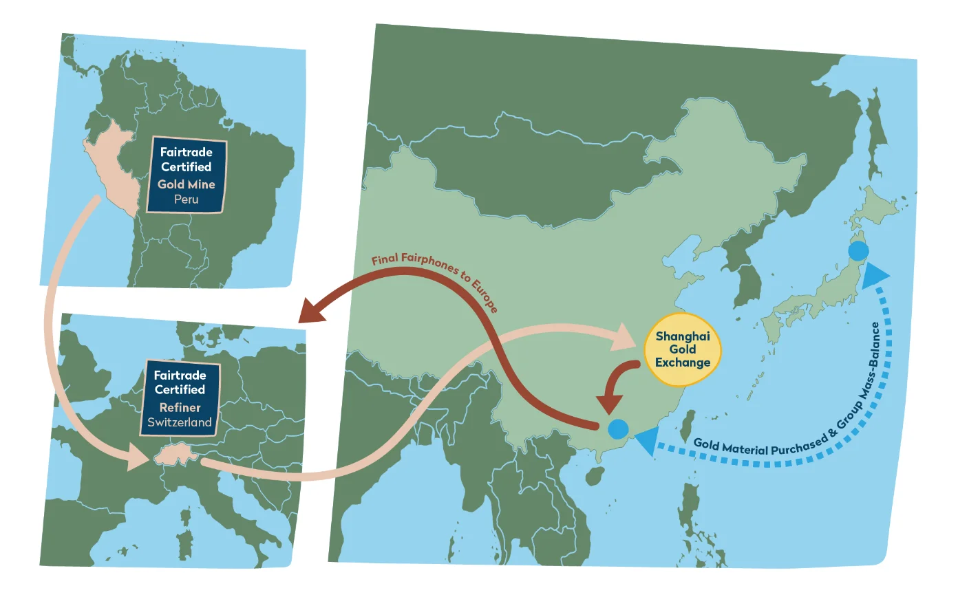 Similar to the Fairphone 3 model, the Fairtrade certified gold remains separate until the refiner level. Once at the Shanghai Gold Exchange (SGE) it is then mixed with non-Fairtrade gold. Our component supplier in Japan (Hirose) then purchases enough gold from SGE to cover the amount of Fairtrade gold claimed by Fairphone. With this model, Fairphone contributes to the equivalent premium of the Fairtrade gold claimed for its supply chain and production volume.